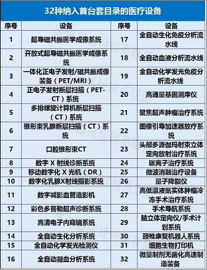 依據(jù)工信部最新發(fā)布的《首臺(套)重大技術(shù)裝備推廣應(yīng)用指導(dǎo)目錄》,共有32種醫(yī)療設(shè)備產(chǎn)品可以享受到“首臺套”推廣應(yīng)用政策的扶持。