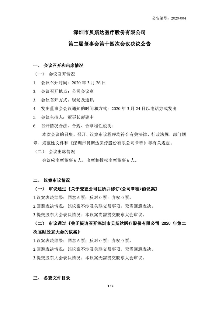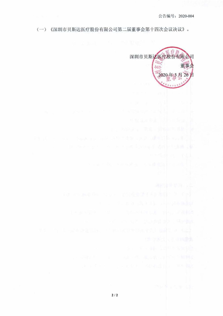 2020-004 貝斯達(dá) 第二屆董事會第十四次會議決議公告
