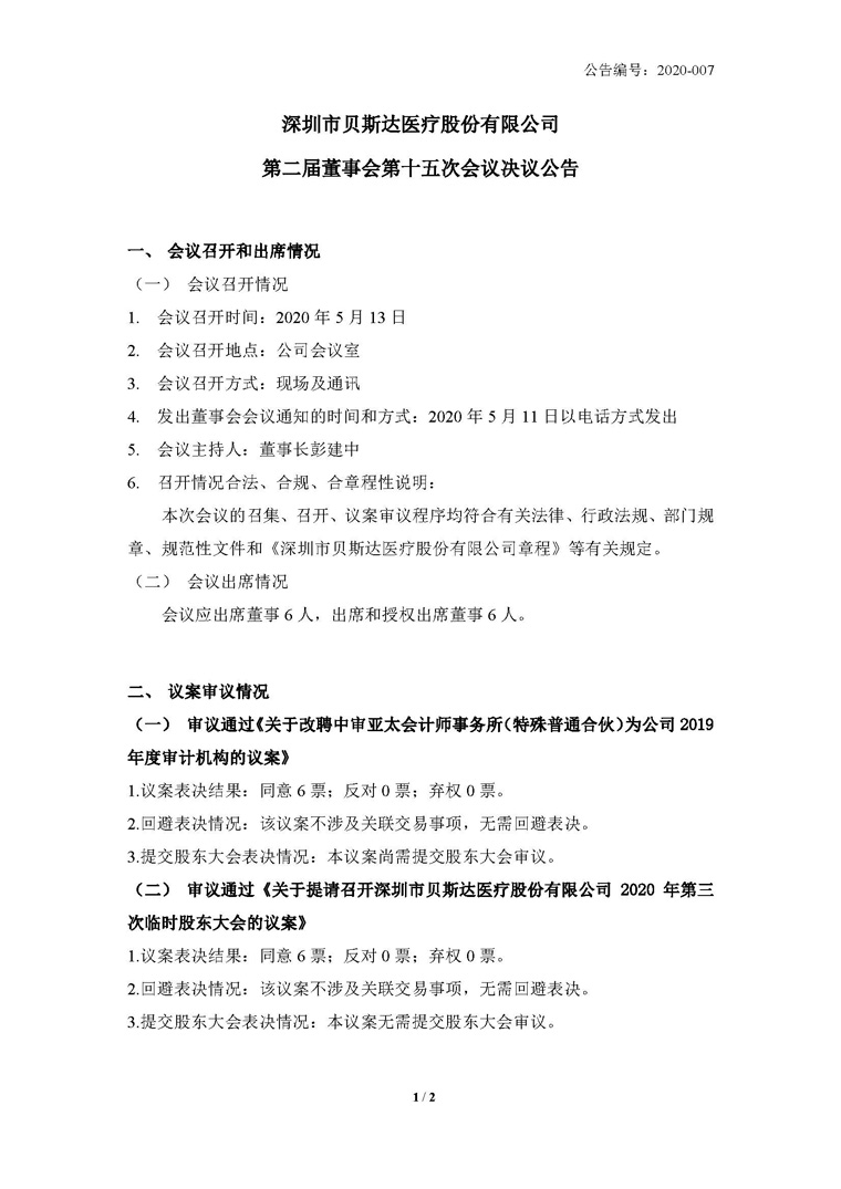 2020-007-貝斯達(dá)-第二屆董事會第十五次會議決議公告