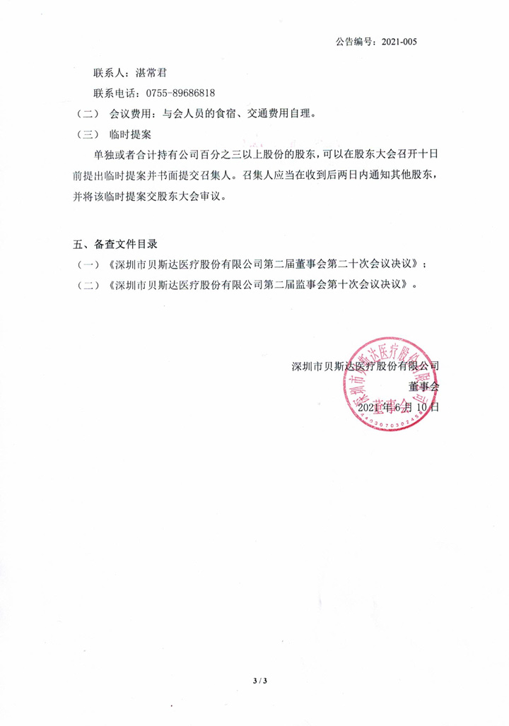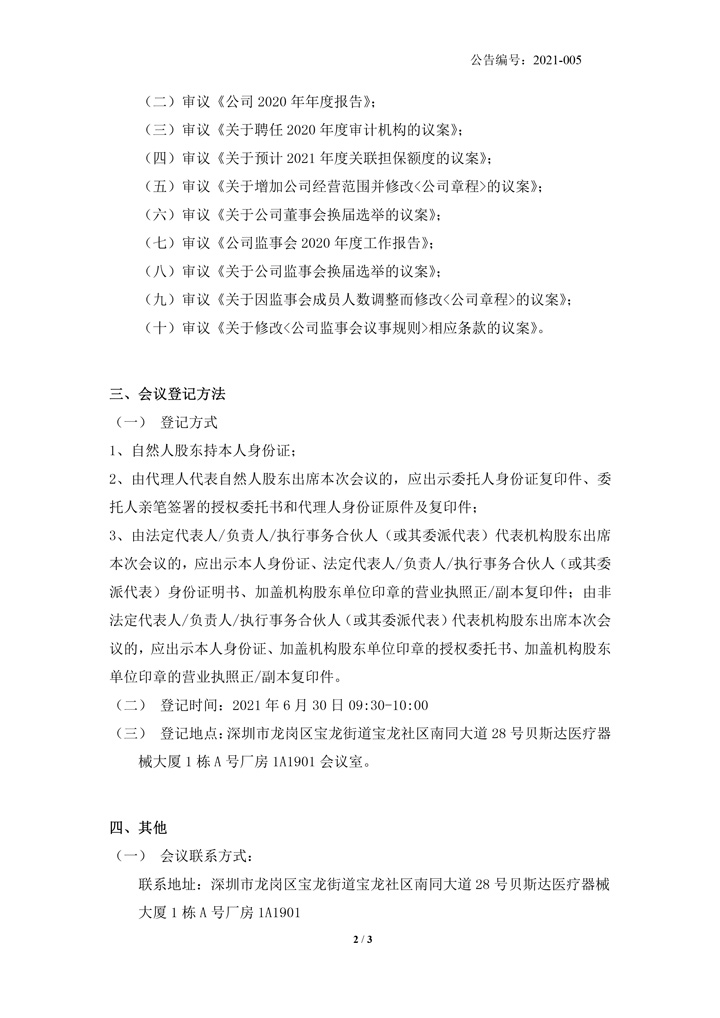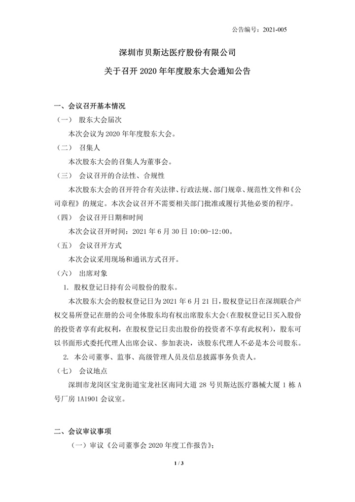2021-005 貝斯達 關(guān)于召開2020年年度股東大會通知公告