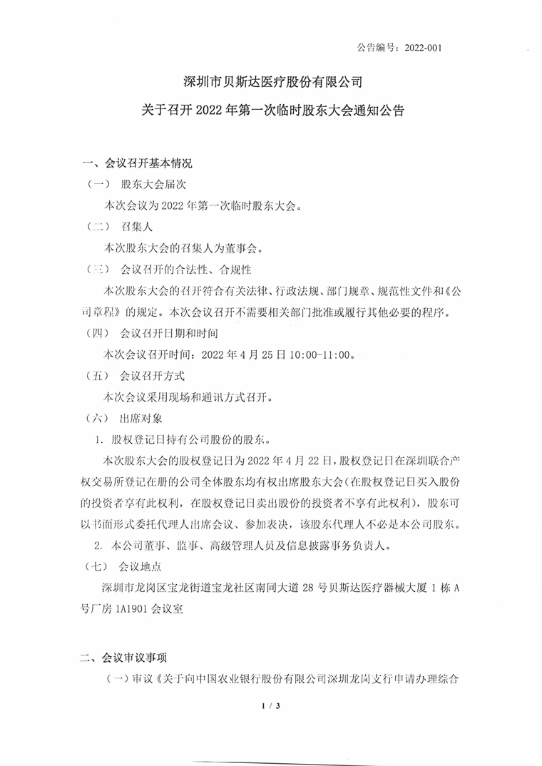 2022-001-貝斯達(dá)-關(guān)于召開2022年第一次臨時(shí)股東大會(huì)通知公告