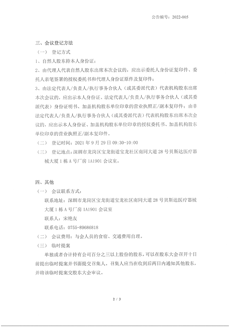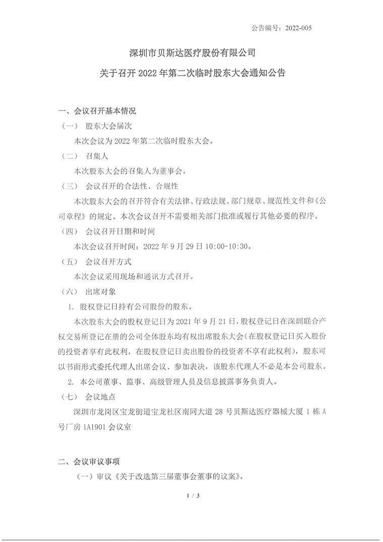 2022-005-貝斯達(dá)-關(guān)于召開2022年第二次臨時股東大會通知公告